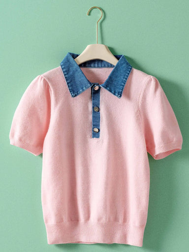 Achieve a chic, updated preppy look with this short-sleeve knit sweater. The classic knit body is sharply contrasted by a dark wash denim collar an...