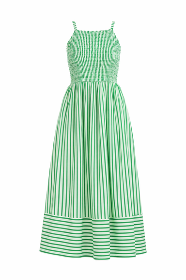 Striped sleeveless midi dress featuring self-tie shoulder straps and shaped bust detail. Smocked panel at back. Pocket at side. Lined. Woven. Non-s...