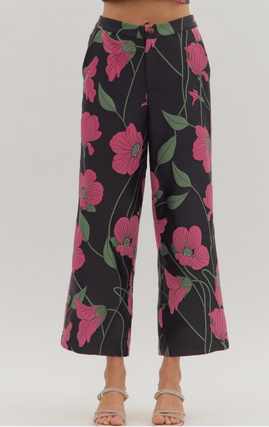 Floral print wide leg pants featuring zip-fly button closure and elasticated back waistband. Side pockets. Unlined. Woven. Non-sheer. Lightweight.