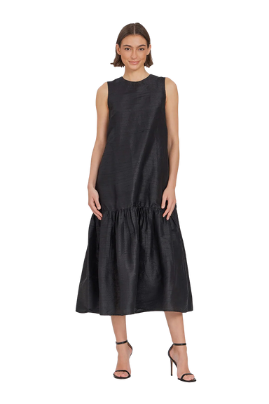 Sleeveless Midi length Bow tie closure on back Drop waist A-line skirt 100% silk Designed in Charleston and manufactured at the highest quality fa...