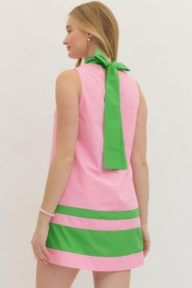 Solid sleeveless mini dress featuring contrast banding detail. Tie closure at back neckline. Pocket at side. Lined. Woven. Non-sheer. Lightwei...