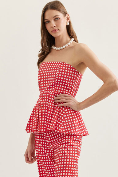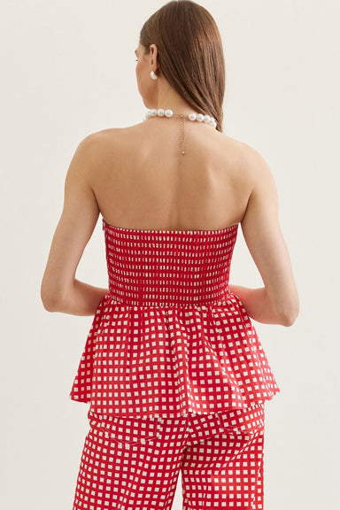 Checkered strapless peplum top featuring flared hem detail. Side zipper closure. Smocked back panel. Unlined. Woven. Non-sheer. Lightweight.