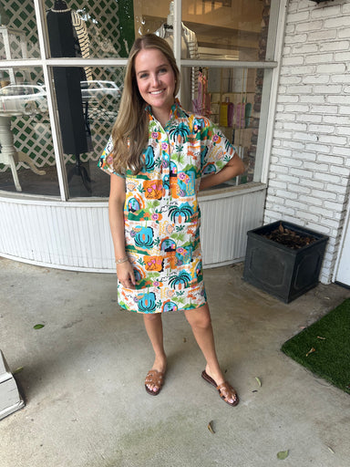 The Emery Dress is a vibrant mini that captures attention with its ziggy palm print. Featuring a relaxed silhouette with a gathered neckline and lo...