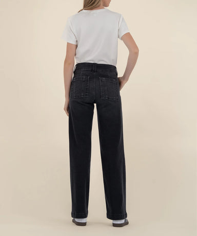 Discover the perfect blend of style and comfort with these high-rise straight leg jeans in a sleek black wash. Featuring unique porkchop pockets, ...