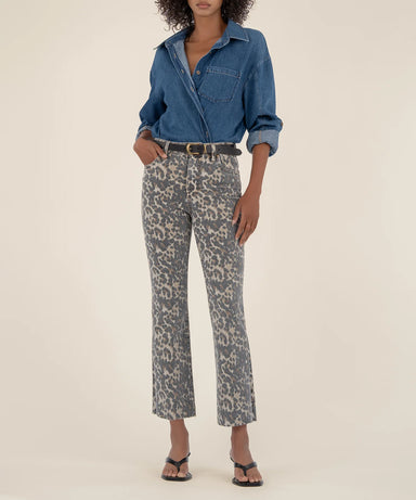 $109.00| /Make a statement with these high rise ankle flare pants, featuring a fierce animal print and edgy raw hem detail. The trendy flare cut at the ankle...