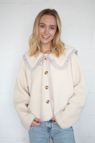 Sherpa jacket with an oversized Peter Pan collar and gingham ties.