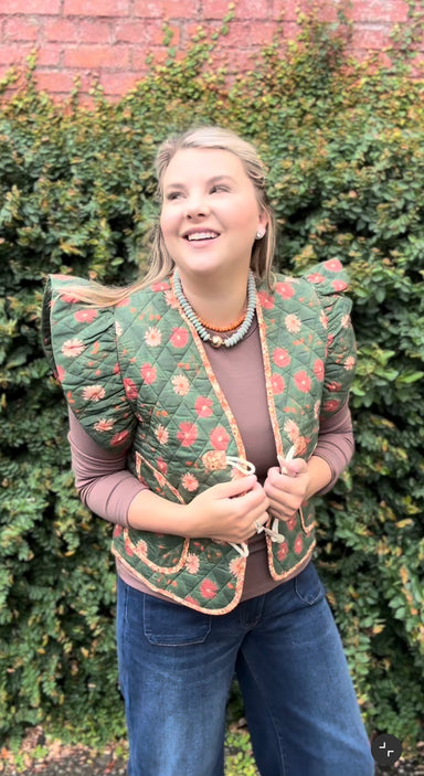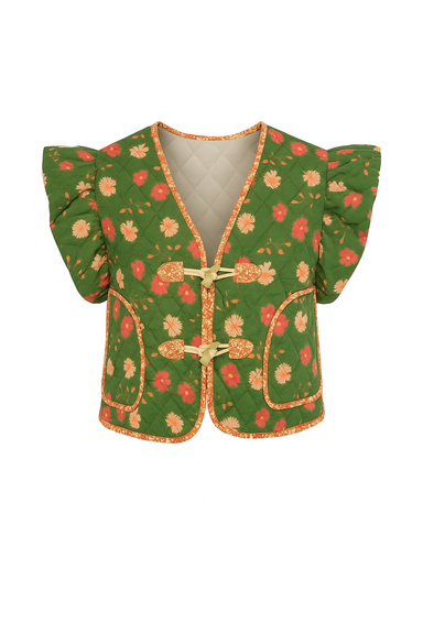 Floral print quilted puff ruffle sleeve waist-length vest featuring contrastn accent binding finish. Toggle closure at front. Front pockets. Lined....
