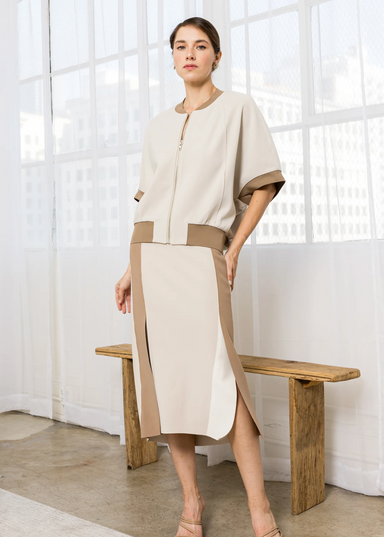 Live in style with our Katy zipper jacket. Made with high quality stretch knit crepe. Zipper front. Colorblock. Above elbow length sleeves. Ribbed ...