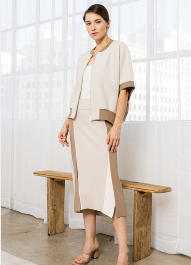 The Jolene Skirt. Beautifully made with high quality stretch matte crepe knit. Small slits on both sides. Color blocking panels. Elastic waist for ...