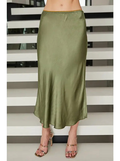 Silky/viscose/rayon slip skirt with lace elastic waistband This italian viscose slip skirt is designed with an elastic waistband and a midi-length...