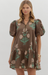 Floral short bubble sleeve ruffle hem mini dress featuring ruffle neck band collar gold accent button closure. Side pockets. Lined. Woven. Non-sheer. Lightweight.