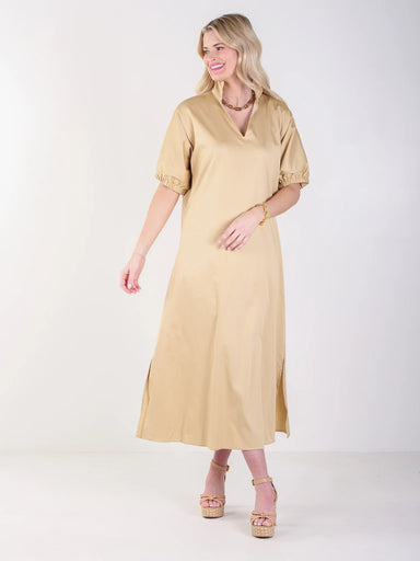 Long dress in fuchsia pink cotton poplin. Featuring a square neckline and short puffed sleeves with elastic trim. Side pockets.