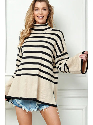 $54.00| /Striped v-neck lightweight sweater top w/ accent color at neckline, cuffs, & hemline
