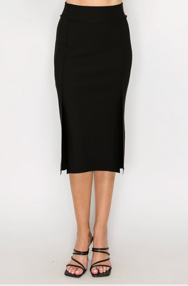 The Kamari Skirt. A sleek skirt made with high quality stretch matte crepe knit. 2 side slits. Elastic waist. Mid calf length. Comfort and stylish....